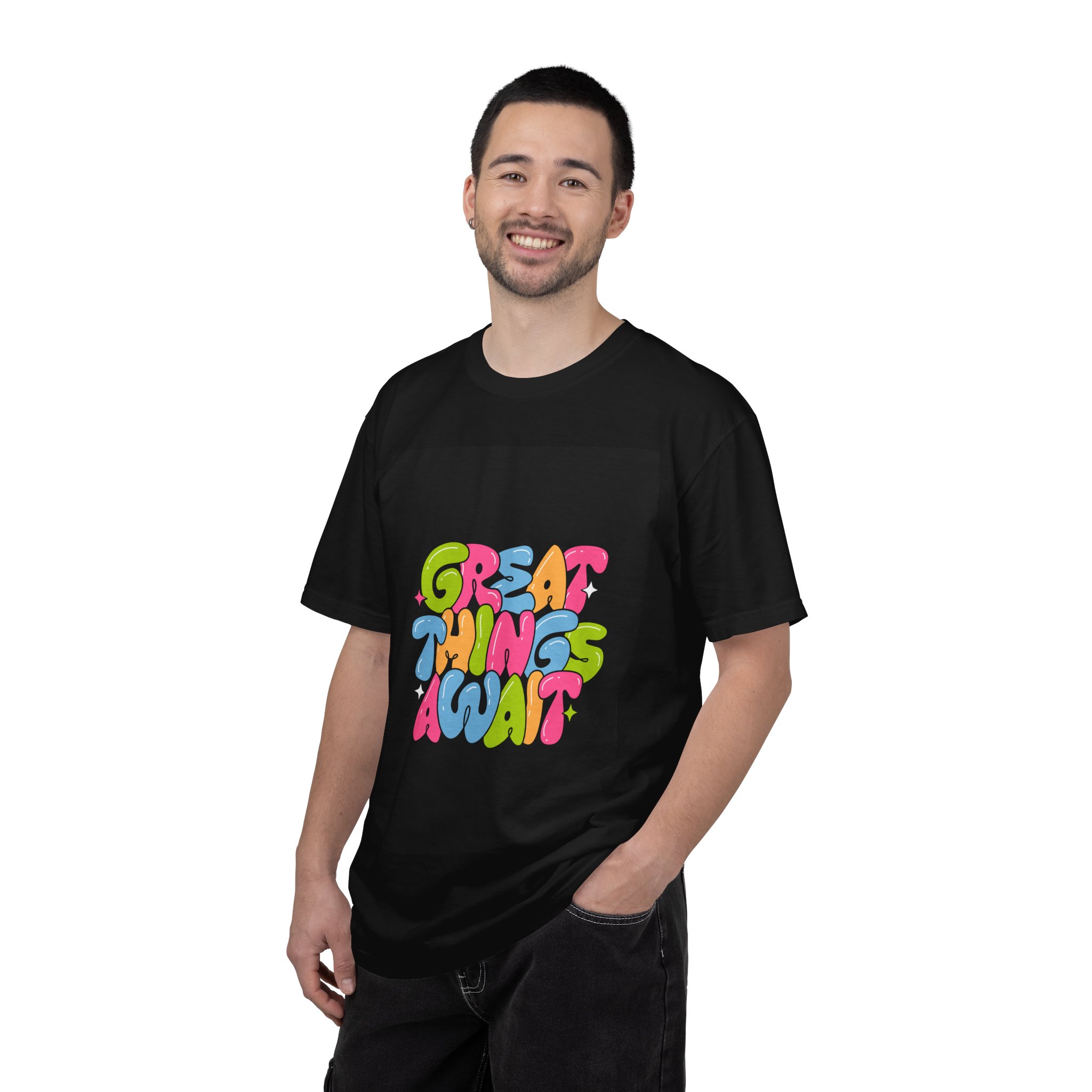 A relaxed, heavyweight tee dyed after construction for a lived-in softness. The bold, colorful “Great Things Await” artwork sits on a deep black panel that pops against the tee’s washed cotton—playful, optimistic, and unmistakably casual. Wear it when you want a little extra brightness in your day: running errands, meeting friends for coffee, or heading out to a weekend market. The garment-dyed fabric gives a softened color and texture that feels like an old favorite from the first wear. With durable double-needle seams and a tubular, side-seam-free build, this shirt holds up to frequent wear while keeping long lines and a clean silhouette. Available in sizes S–4XL and dozens of colorways, it’s an easy, confidence-boosting staple for anyone who likes bold graphics and vintage-inspired comfort.